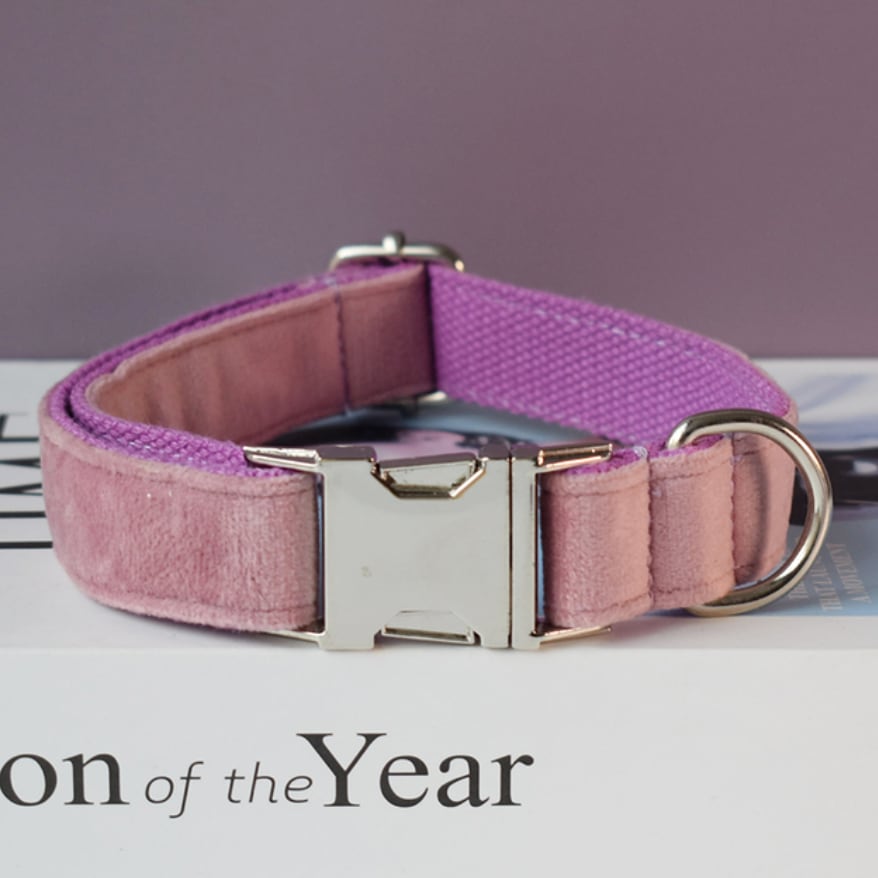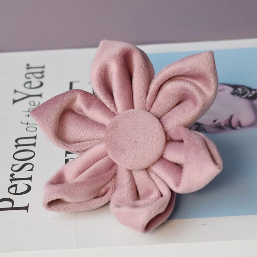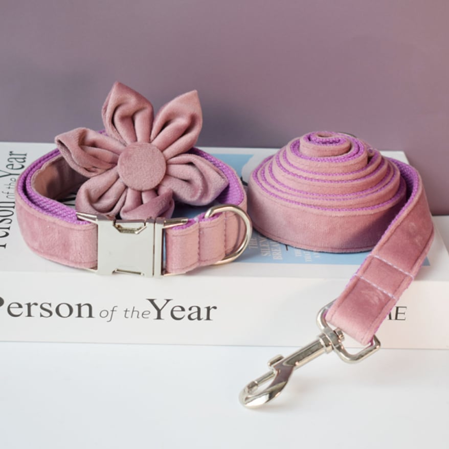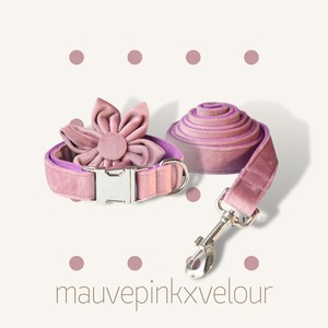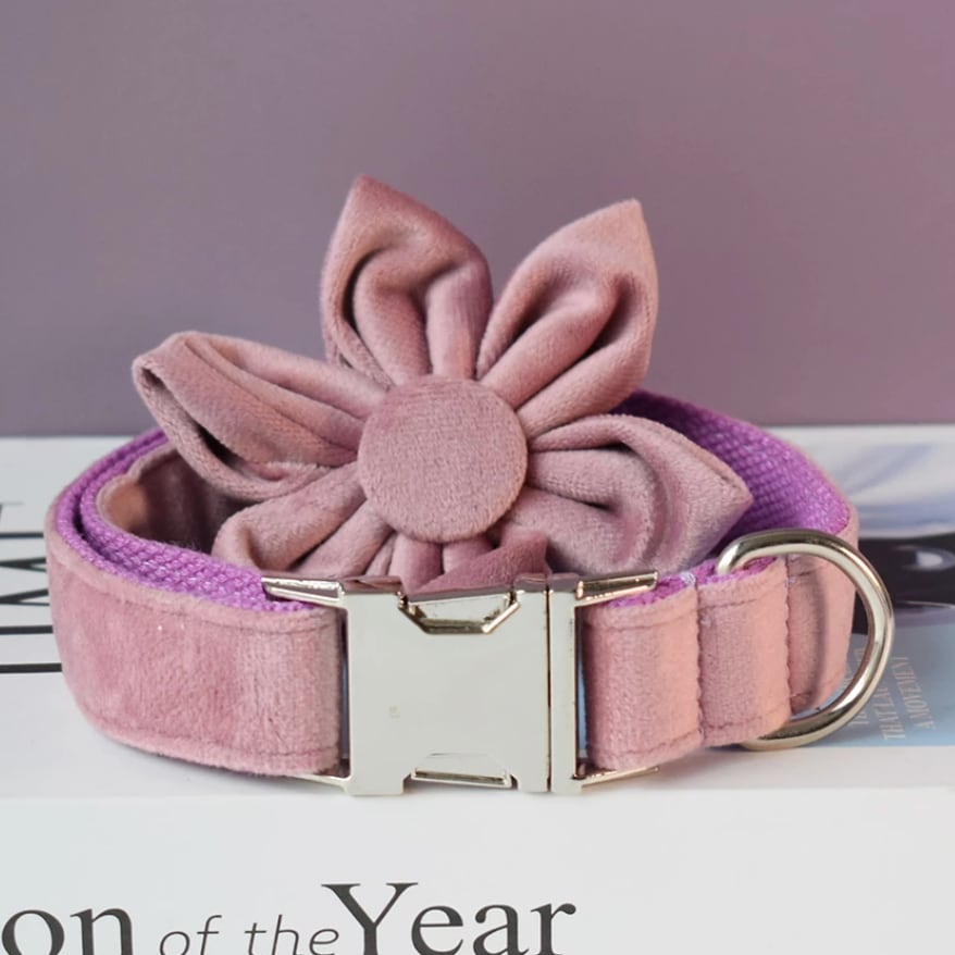 【お花シリーズ】モーヴピンク×ベロア迷子札刻印サービス・犬用首輪&フラワー