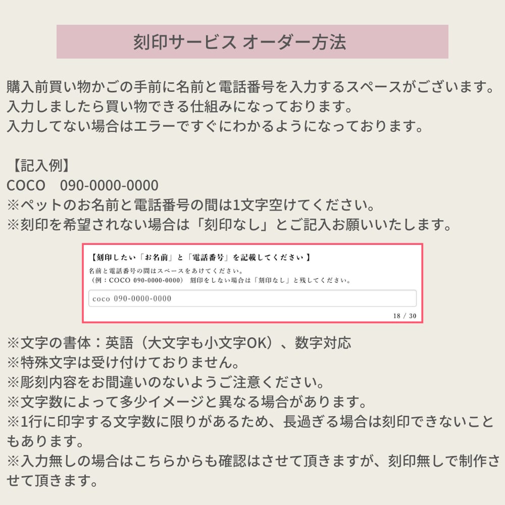 首輪のバックルに、ペットの名前と電話番号を彫刻できます。