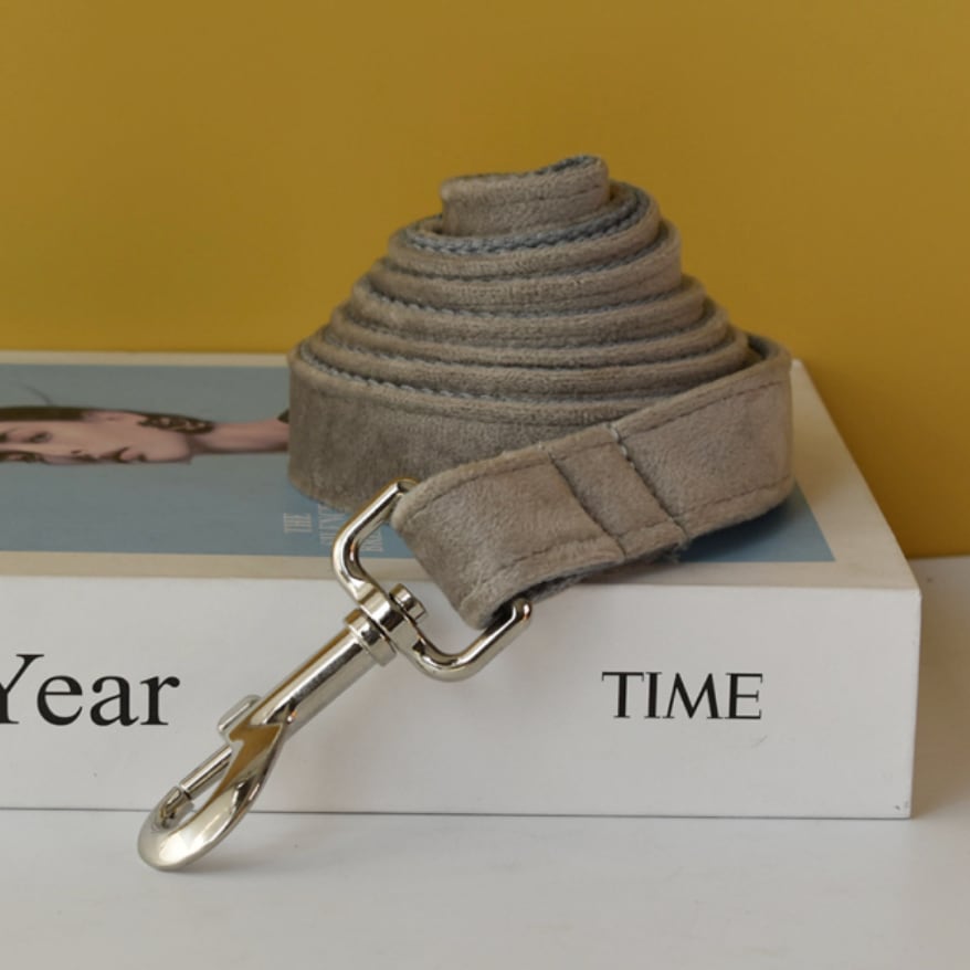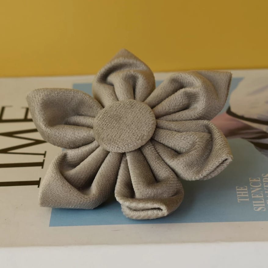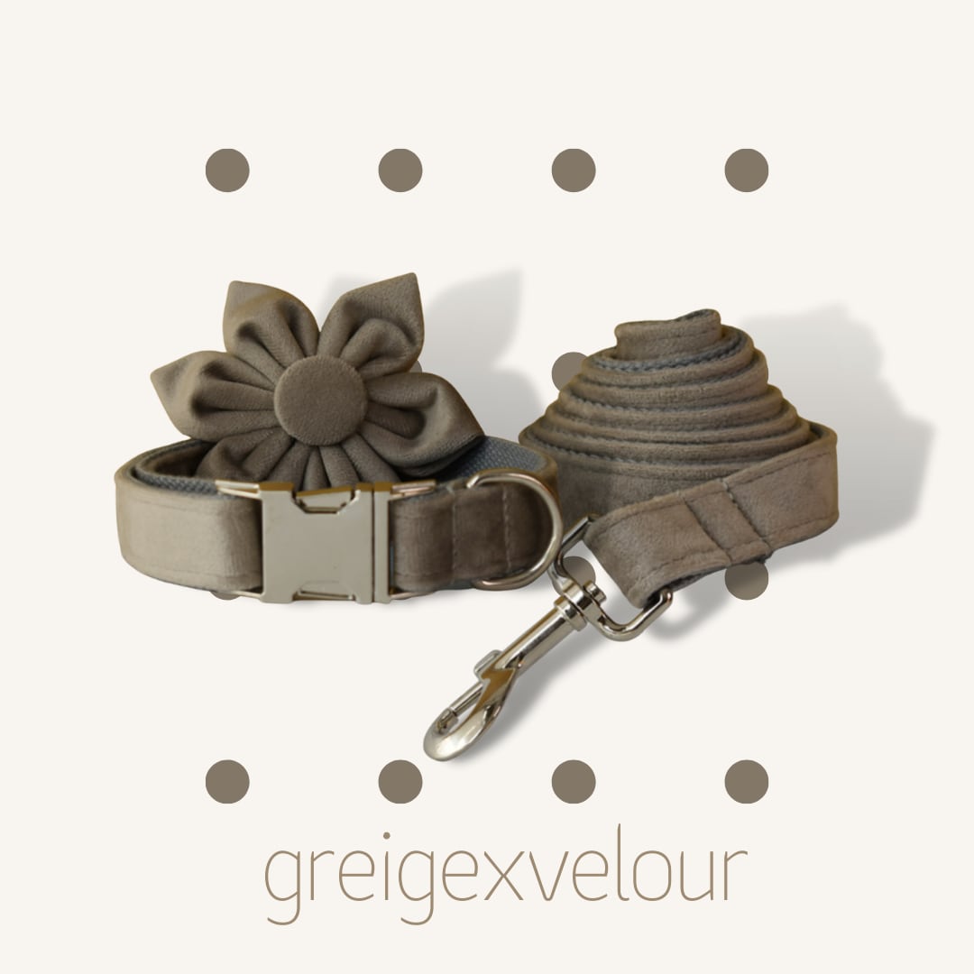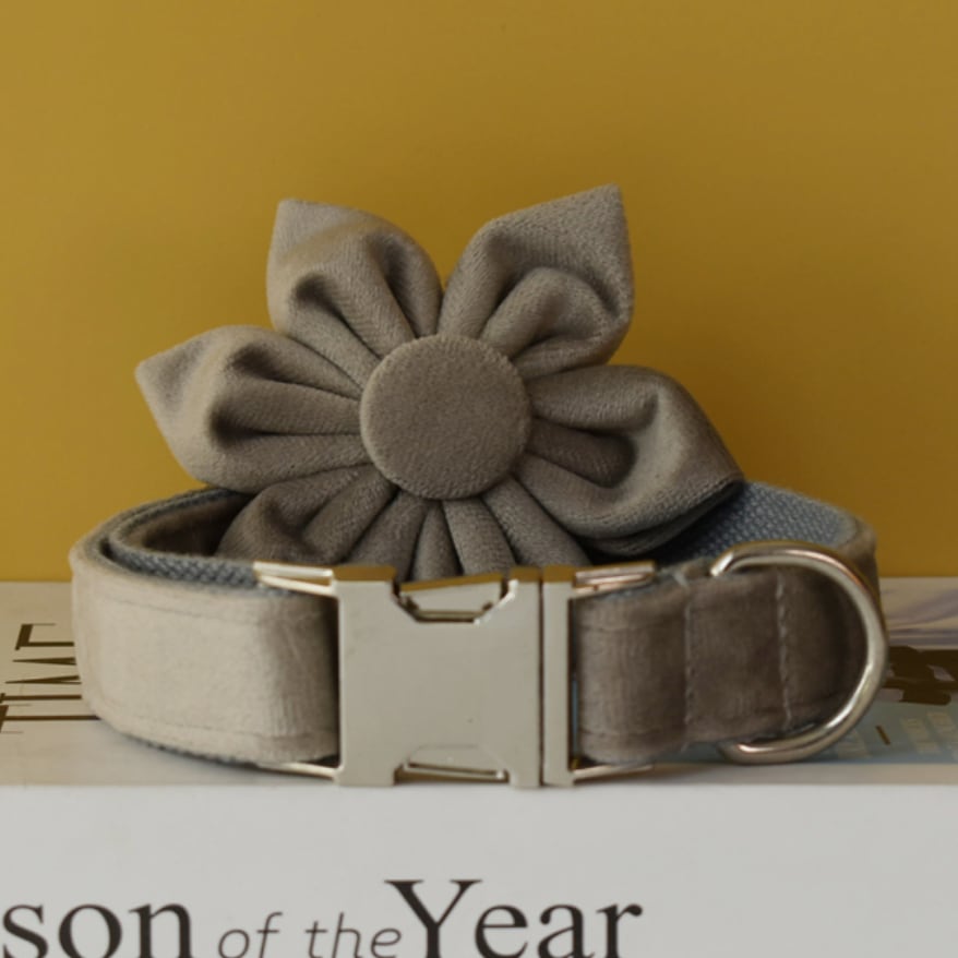 【お花シリーズ】グレージュ×ベロア迷子札刻印サービス・犬用首輪&フラワー